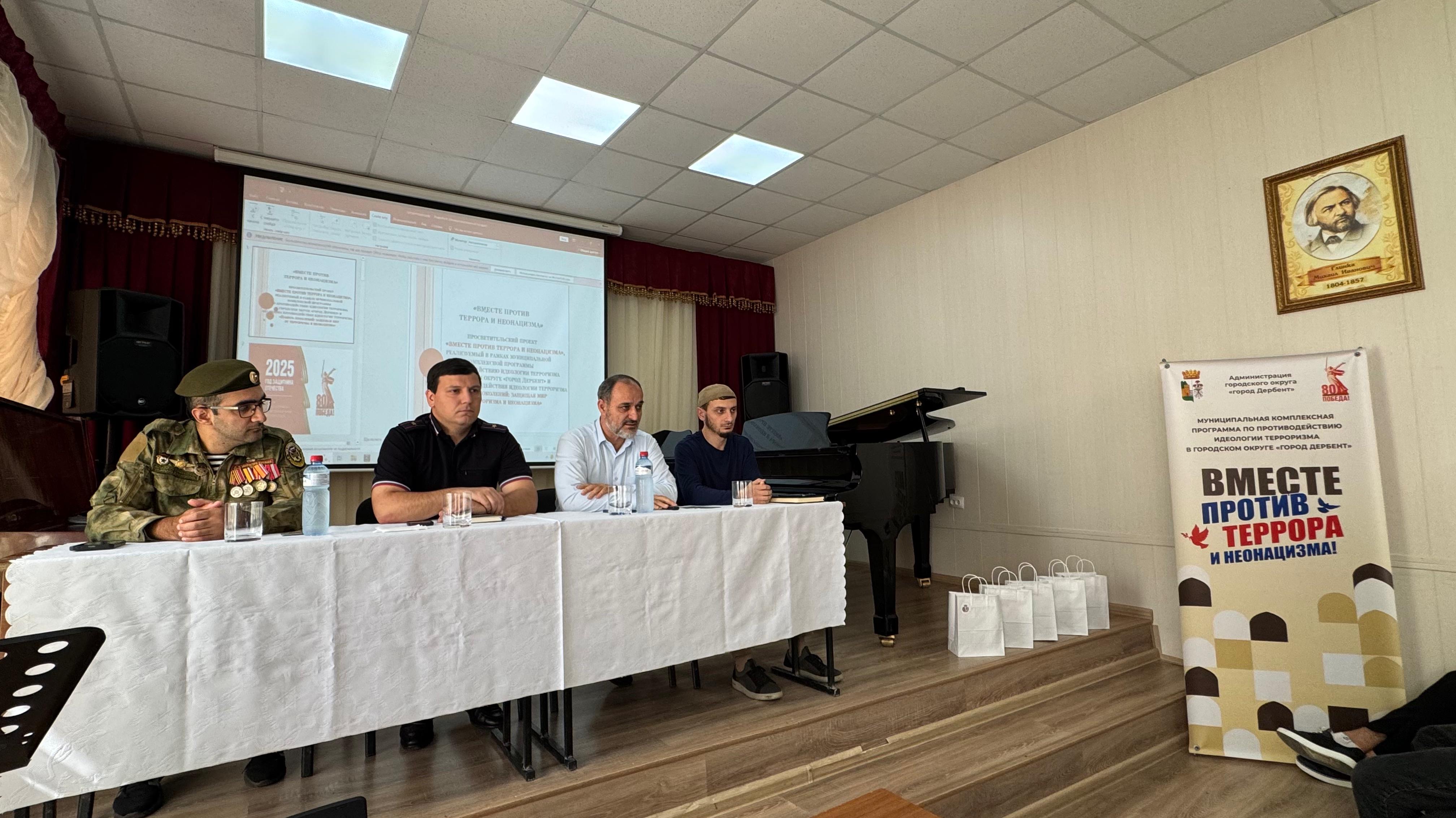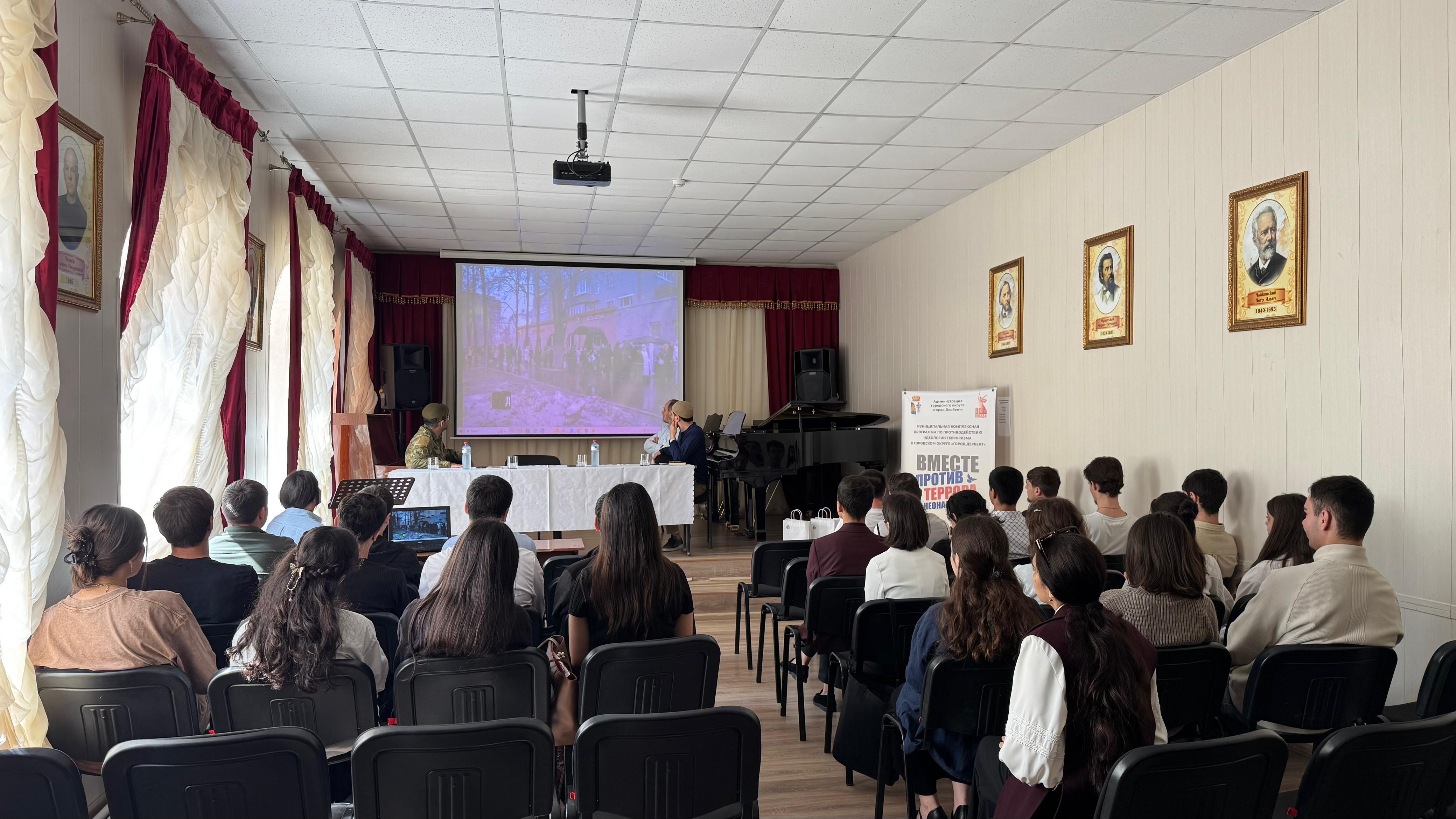 Сегодня, 26 сентября, в Дербентском музыкальном училище им. Ашурова прошел показ документального фильма «Крокус. Общая боль», а также профилактическая беседа со студентами в рамках муниципальной комплексной программы по противодействию идеологии терроризма в городском округе «город Дербент» и месячника противодействия идеологии терроризма «Память поколений: защищая мир от терроризма и неонацизма».