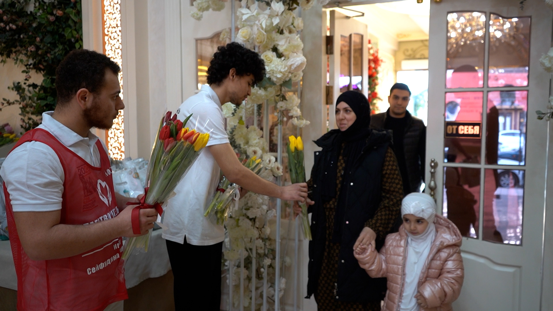 Гостей у входа встречали волонтёры, которые вручали им цветы и памятные подарки.